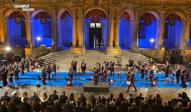 La Fanfara del 12° Reggimento Carabinieri Sicilia dei Carabinieri ieri sera protagonista a Noto, in Piazza Municipio, nell’ambito delle iniziative della primavera barocca 2022.